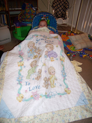 I used to cross stitch for fun when I was young, so when I got pregnant with Ethan I started a blanket for him to pass the time. I finished it a few months after he was born.
